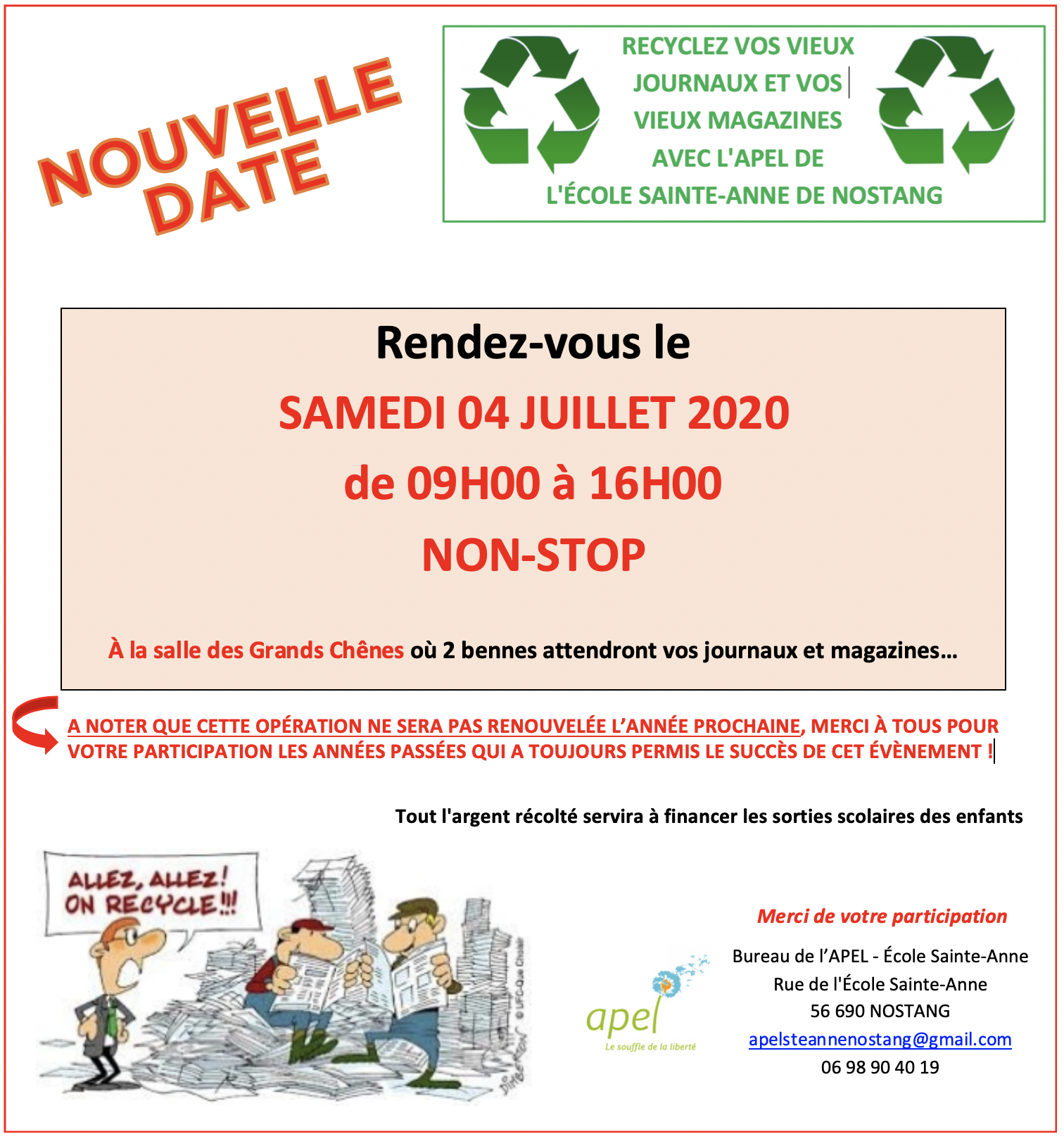 L’école Sainte-Anne de Nostang vous informe de la nouvelle et ultime date pour le dépôt des journaux et papiers, vendus au profit des activités des élèves: